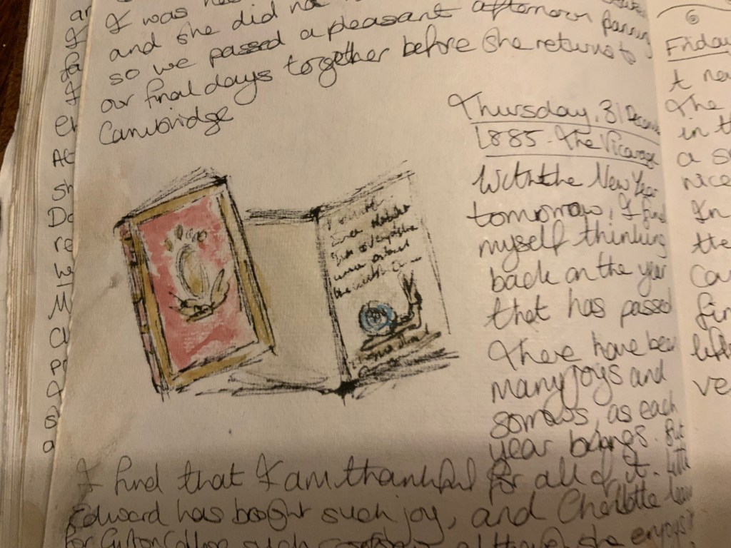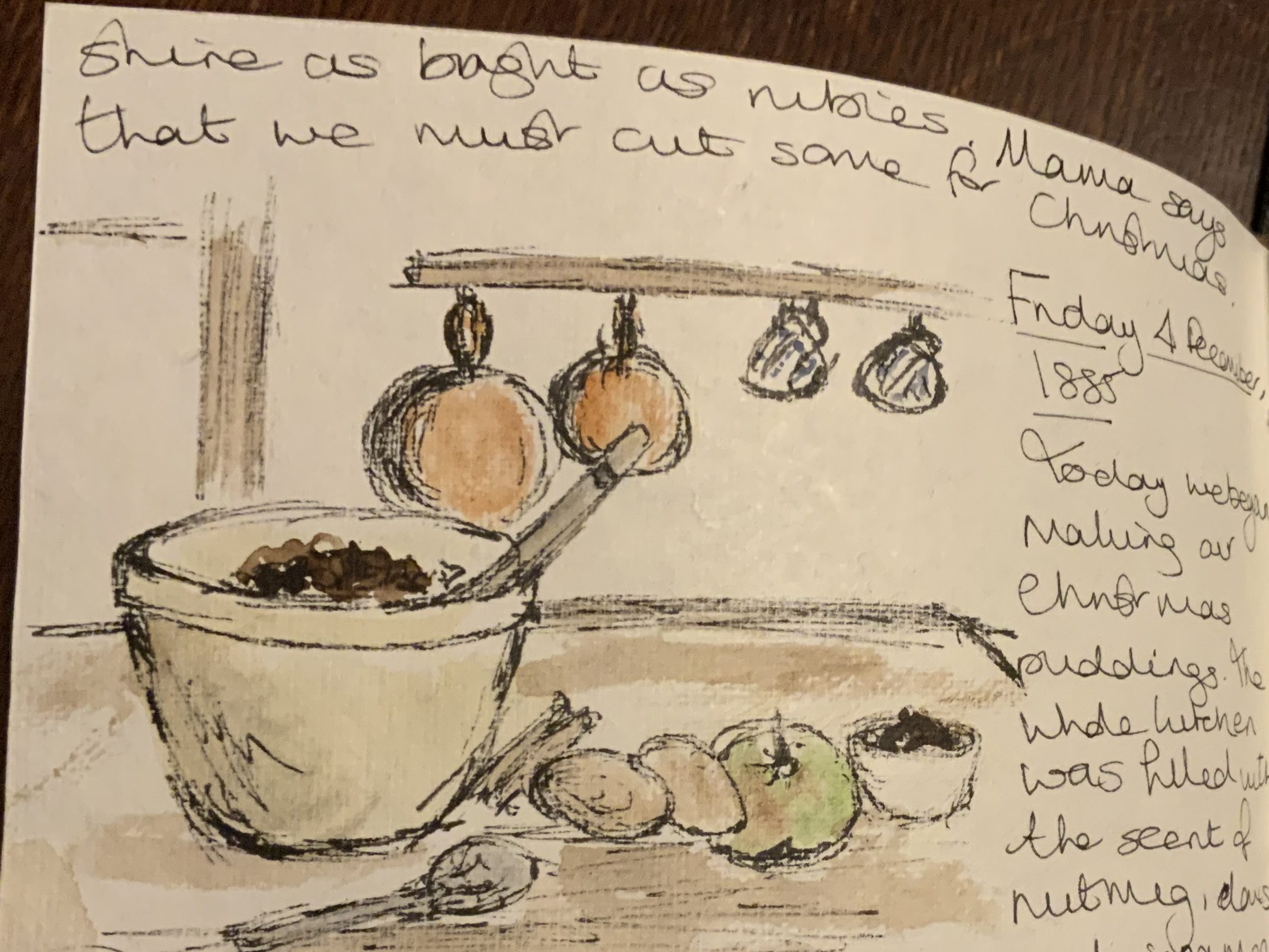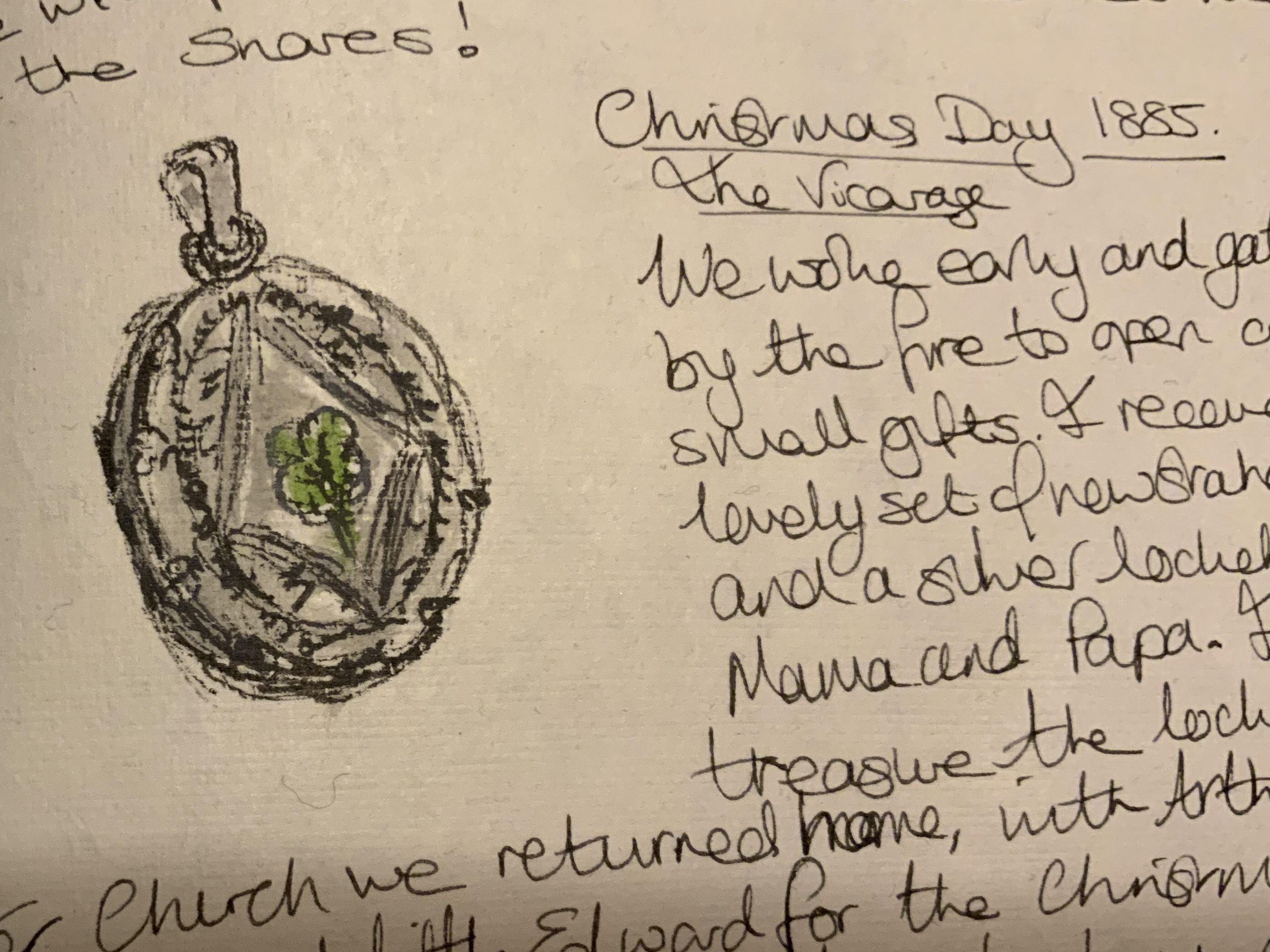 Friday, 4 December, 1885. A charming sketch to accompany the diary entry for the day. “Today we began making our Christmas puddings. The whole kitchen was filled with the scent of nutmeg, cloves and cinnamon. Mama let me mix the pudding, and we all took a turn at stirring it, and making a wish…”Christmas Day, 1885. “We woke early and gathered by the fire to open our small gifts. I received a lovely set of new stationery and a silver locket from Mama and Papa. I shall treasure the locket always.”Monday, 28 December, 1885. Emily writes of a visit to her friend, Charlotte East. In earlier diary entries Emily has shared some of her sightings of the Snares as with Charlotte, however “…I took with me my much cherished notebook and sketch pad, in which I have been keeping my Wiltshire Snare observations. But I was hesitant in showing Charlotte…”